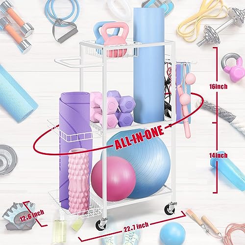 4-IN-1 FUNCTION: Our workout storage rack equipped with 2 layers of dumbbell racks, a side basket for yoga mat and foam roller, several side hooks for storing resistance band and jump rope. Bottom storage rack is perfect for storing balls, yoga blocks and other exercise equipment
