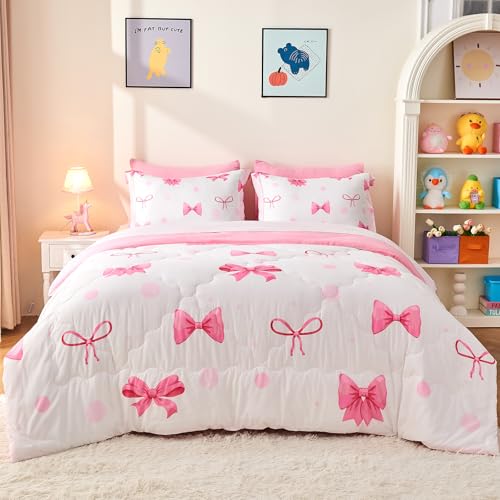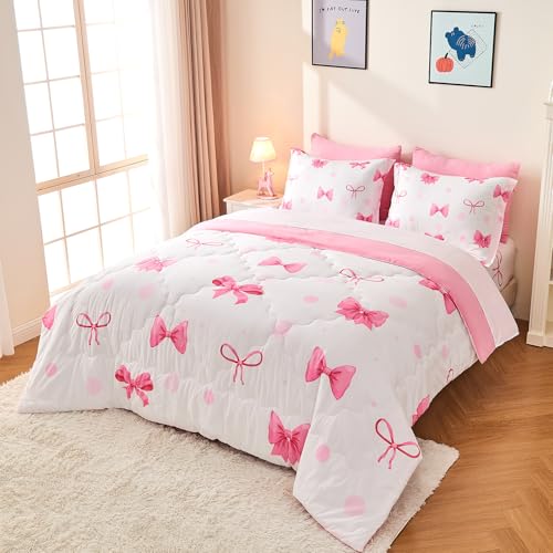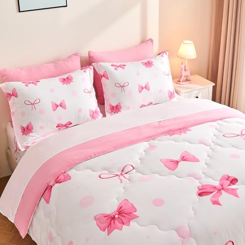 Wajade 7 Piece Pink Bow Bedding Set for Girls Kids Full Size Comforter Set with Sheet and 2 Pillowcases 2 Pillow Shams Cute Girls Bed in a Bag as Birthday Choice