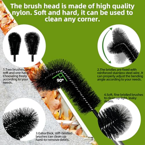 13FT Gutter Cleaning Tool, Newly Upgraded Gutter Brush, with 2 Brushes Heads, Easily Clear Roof Leaves & Debris, Black
