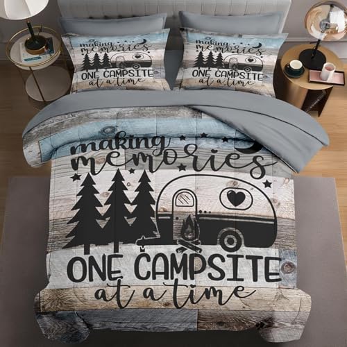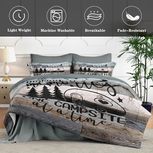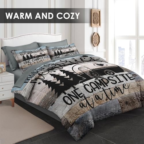 7 Pcs Queen Size Comforter Set with 2 Pillowcases & 2 Shams, Retro Wood Camp Camper Bedding Set for Kids and Adults, Inspirational Motivational Bed in a Bag with Flat Sheet and Fitted Sheet